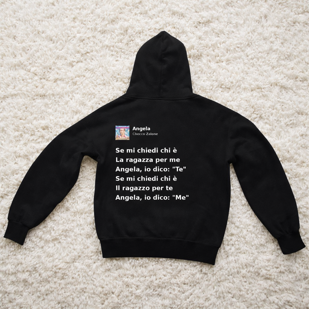 Felpa con citazione della canzone "ANGELA" di Checco Zalone stampata sul retro.